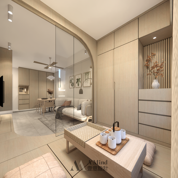 兩房設計|實用面積:380平方呎禪意日式|溫暖簡約設計心得:設計以簡樸天然木色為主調,搭配淺灰色調的水泥地磚。簡約的紋路 及 统一的色調,營造出一個既舒服 又自然的和式家居,全屋摒棄複雜的天花造型,保留原始自然的家居氣息,讓屋主置身於大自然一樣。